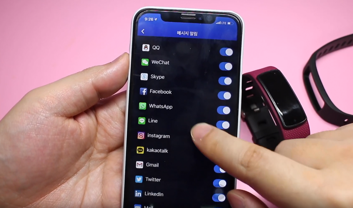 메시지 알림에서 페이스북, 왓츠앱, 라인, 인스타그램, 카카오톡, 지메일, 트위터, 스카이프 등등 여러앱들을 설정할수 있는데요 여기 없는 앱들의 알림메시지도 대부분 전송이 되어서 상당히 편리하게 사용할 수 있었습니다.