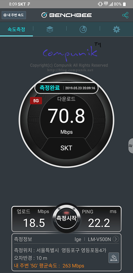 SKT 5G 속도입니다. 이번에는 아주 여러번 측정을 해보았습니다.