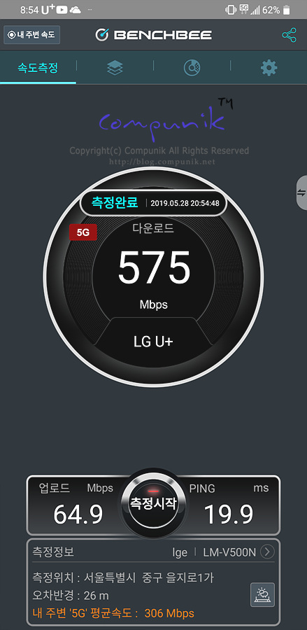 시청앞에서 LG U+ 5G 속도는 575, 577, 578, 499 Mbps입니다.