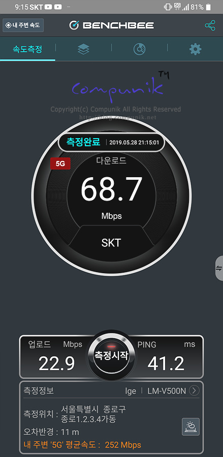 처참하였습니다. 68.7, 65.0, 64.2 로 60대에 머물러서 LTE속도수준밖에 나오지 않네요.
