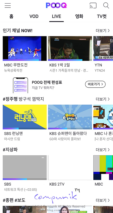 POOQ 은 지상파 3사가 공동으로 만든 컨텐츠 제공 서비스로 실시간 채널과 VOD등을 볼 수 있는 서비스 입니다.