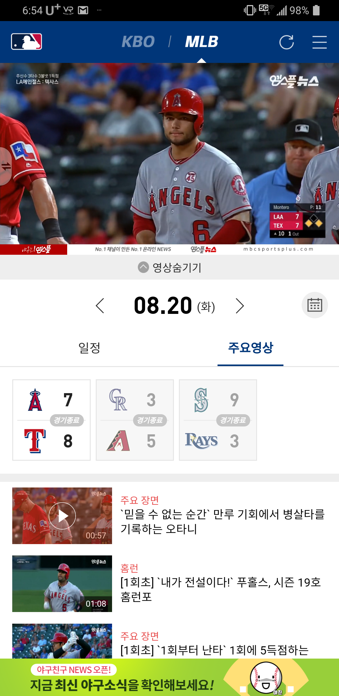 생중계 뿐만 아니라 하이라이트까지 광고없이 즐기는 MLB!