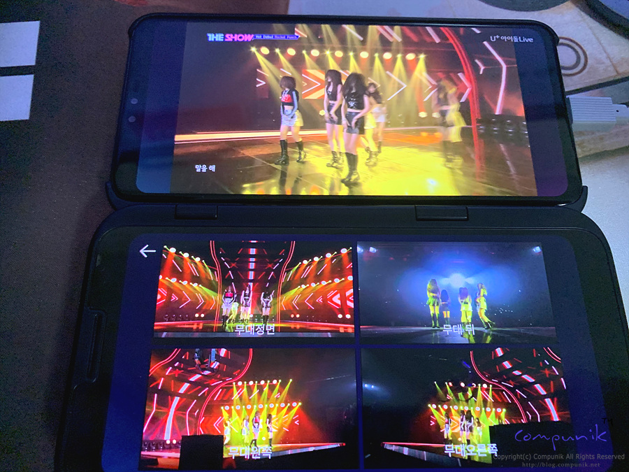 이 기능역시 LG V50 듀얼스크린과 만나 엄청난 기능이 되는거죠. 아래와 같이 영상을 보면서도 무대정면, 무대 뒤, 무대왼쪽, 무대 오른쪽을 선택하시면 바로 이렇게 두개의 스크린으로 두개의 카메라 장면을 볼 수 있습니다.