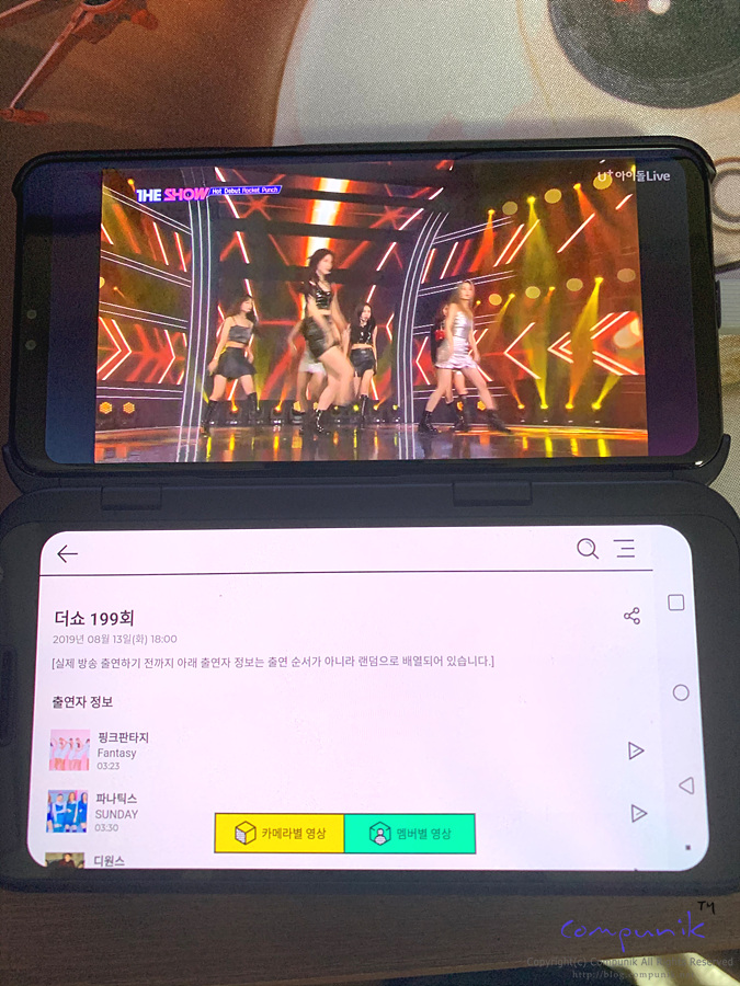 상단에는 원래 영상화면을 보면서 하단 듀얼스크린부분에서는 멤버를 골라서 원하는 멤버의 영상을 동시에 시청이 가능합니다. 엄청나죠