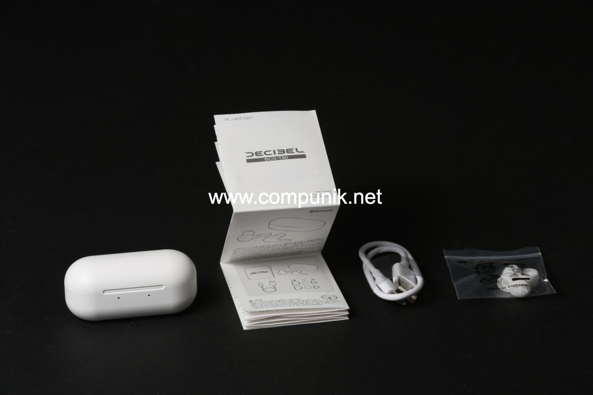 구성품은 bcs-t90 제품, 사용설명서, usb-c타입 충전케이블, 추가이어팁 2쌍입니다.