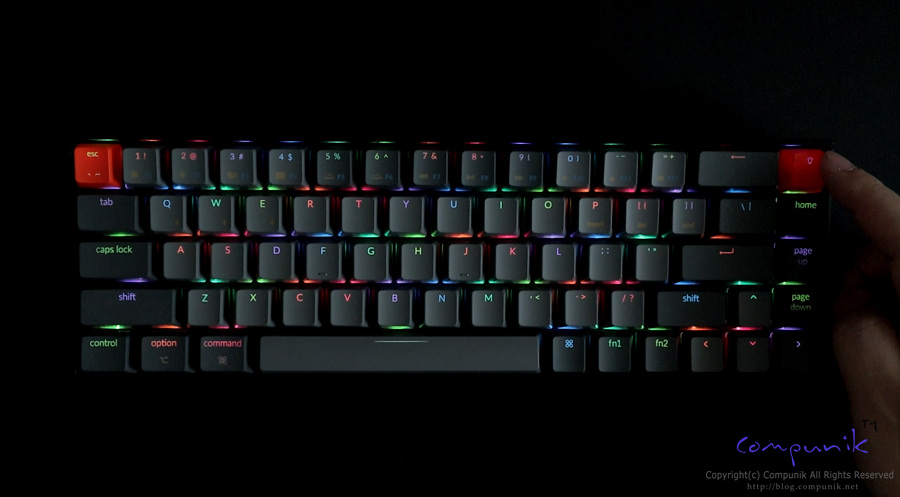 키크론 K6 는 화이트 LED 와 RGB LED 를 선택하실수 있는데요 이 제품은 RGB LED 모델이라서 18개의 다양한 효과를 선택해서 사용할 수 있습니다. 화이트 LED는 15가지 효과가 있습니다.