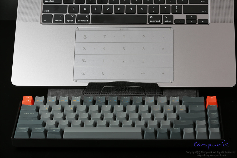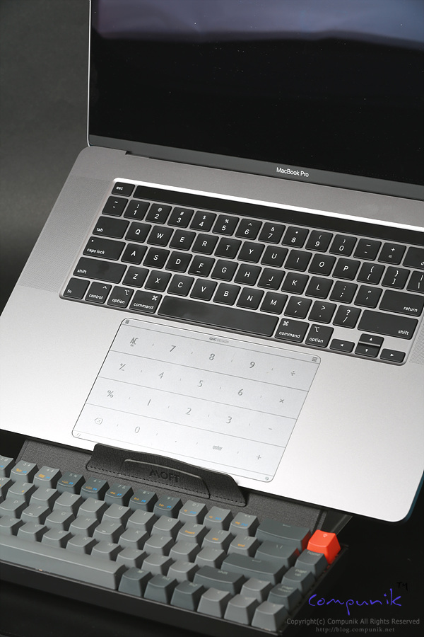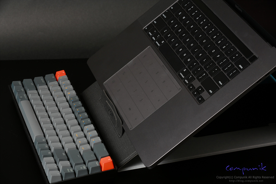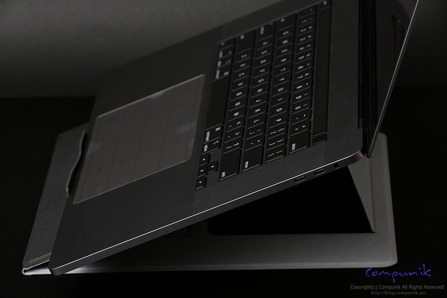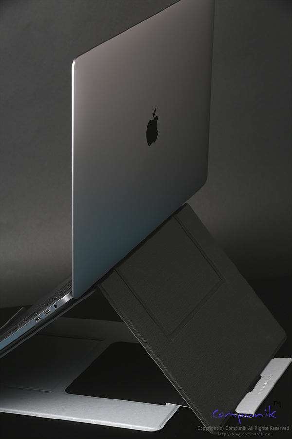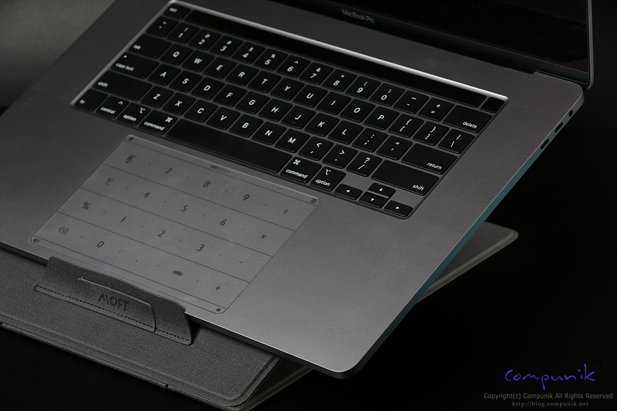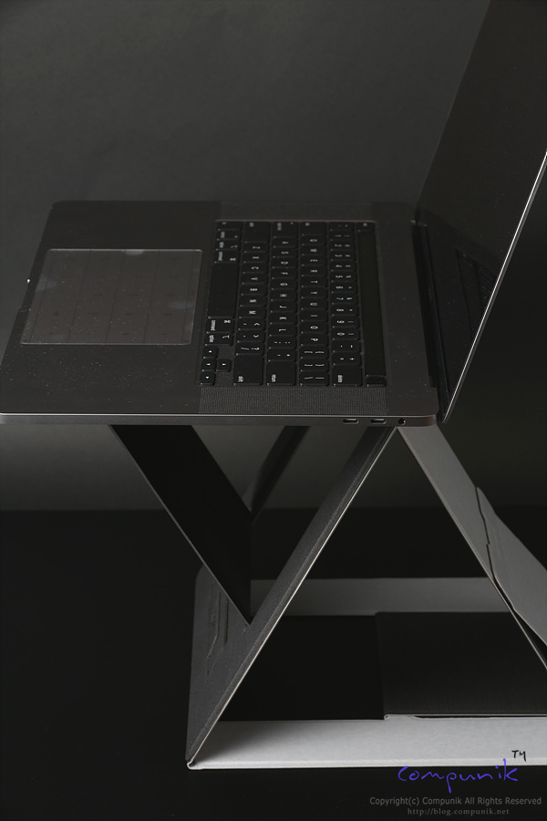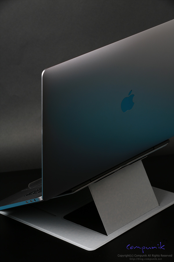 맥북프로 16인치를 거치하고 있는 모습입니다. 거치한 상태로 타이핑과 트랙패드 사용에도 불편함이 없는 각도로 가장 많이 쉽게 사용할 수 있는 모드입니다.