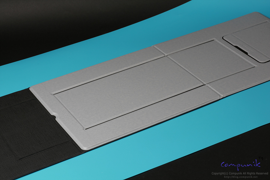 노트북을 받쳐주는 부분이 이렇게 그냥 접히는 부분을 벌려서 하게 되어있습니다. 이부분이 조금더 개선되었으면 좋겠습니다. 튼튼하게 받쳐주긴 하지만 꽤 힘을 주어 당긴후에 노트북을 받쳐주어야 하는데 약간 노트북 각도가 비뚤어 지기도 하고 우글거리는 느낌도 있어서 좀 아쉬웠습니다.