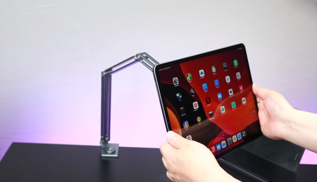 굿밸류 아이패드 마그네틱 암 거치대는 마치 모니터암 사용과 같아서 공중에 아이패드를 띄워서 거치해서 사용가능하게 됩니다. 따라서 책상공간을 전혀 차지않아서 책상을 보다 넓게 활용할 수 있다는점이 큰 장점입니다.