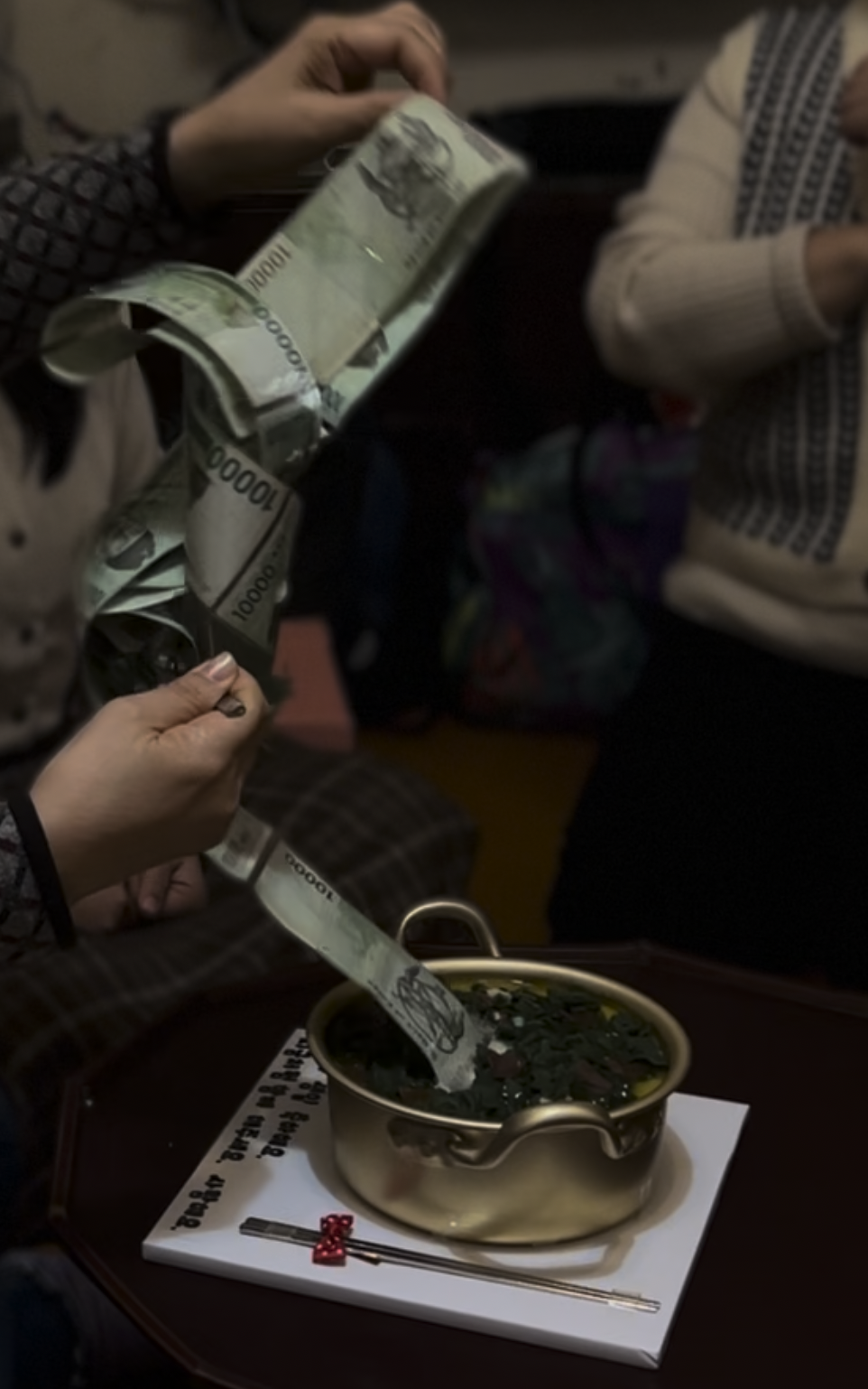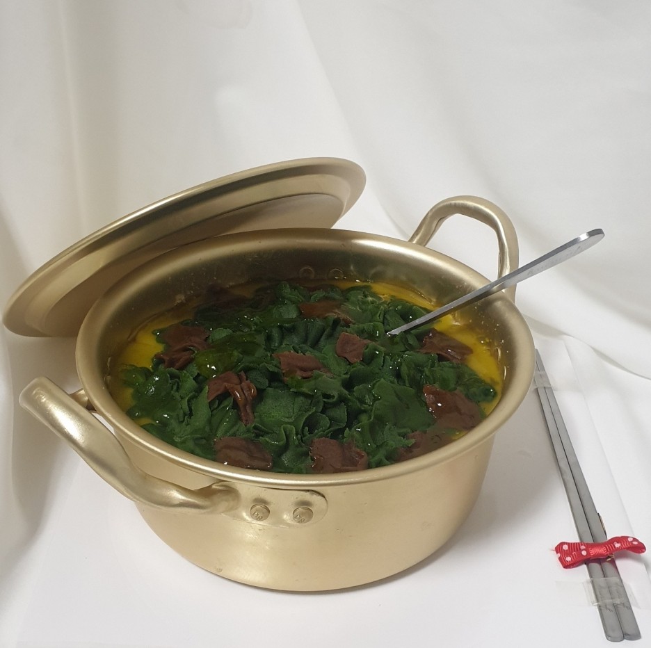 양은 냄비에서 맛있게 끓인 미역국 모양의 생일 떡케이크로 반전케이크로도 유명하답니다.