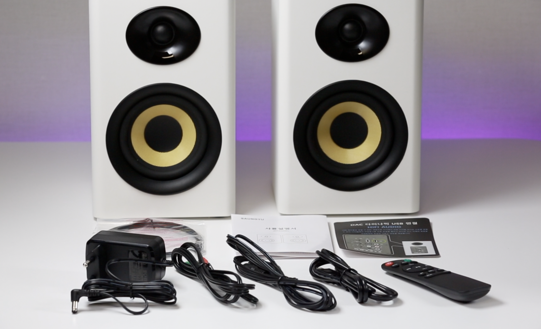 악세사리 박스에는 전원어댑터와 리모컨, usb 연결케이블, 3.5mm to rca케이블, 좌우연결용 RCA 케이블, 광케이블, 사용설명서가 들어있습니다.